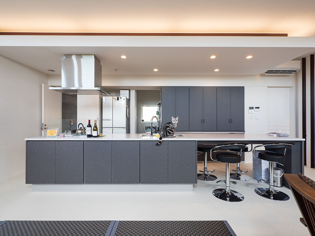 LDKは横長で24畳と広くなっています。圧巻なのは、アイランドキッチンの天板。シンクの横から延長してそのままダイニングテーブルとして使うプラン。幅4m以上ある大きな天板はインパクト大です。料理を作ったらそのまま横に移動して食事し、後片付けも楽。動線も無駄がなくて良いのです。