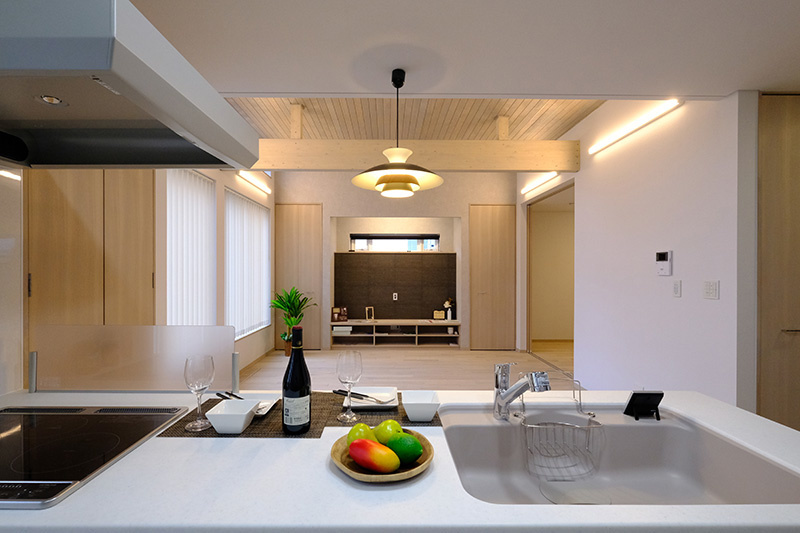 リビングは木の温もりが感じられる一方、「生活感のない家を目指した」と語るご主人の希望通りシンプルですっきりとしたデザインに仕上げました。