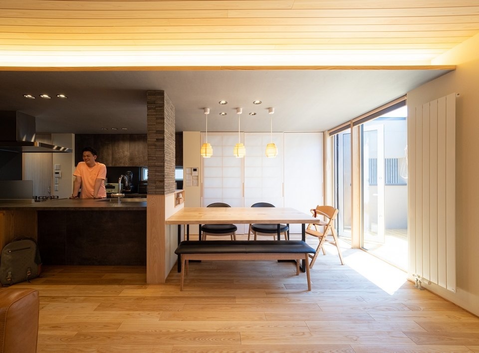 リビングの天井はヒノキを使った羽目板仕上げ。床はタモの無垢材です。ダイニングの天井は間接照明を施し一段低くなっていて、天井の美しい木目が照らし出されています。ヤナギの天板を使った大きなダイニングテーブルはOさんご夫婦が気に入って購入したもの。老川さんおすすめの曲げワッパを使ったペンダントライトとの相性もばっちりです。奥さまの希望で壁面にはパソコン使用や書き物に便利な作業カウンターを造作。向かって右端にある白い障子戸が収まっているところは収納になっています。