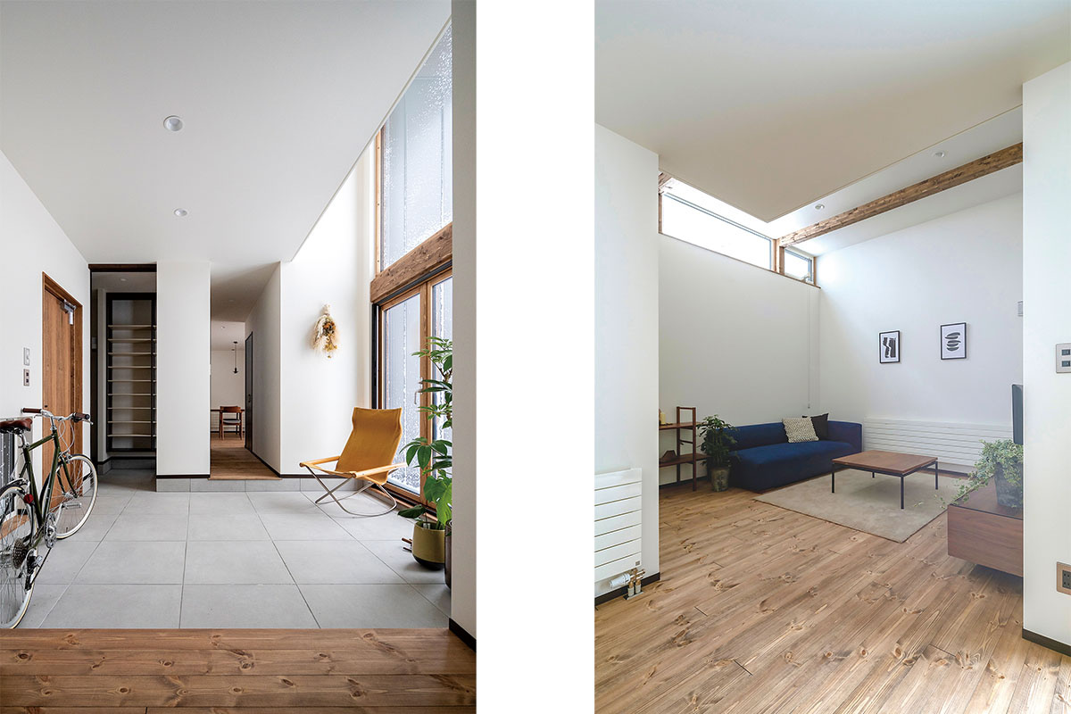 「抑揚」がこのモデルハウスのキーワードで、空間にメリハリを付けた造りが特徴。例えば、トンネル型の小さな空間であるアプローチを抜けた先の玄関は、DIYや趣味の道具の手入れなどを想定した8畳ほどの土間が広がり、さらに風景画のように手稲山を収めた2階の高さまである大きな窓を設けるなど、開放的な玄関に仕上げた。