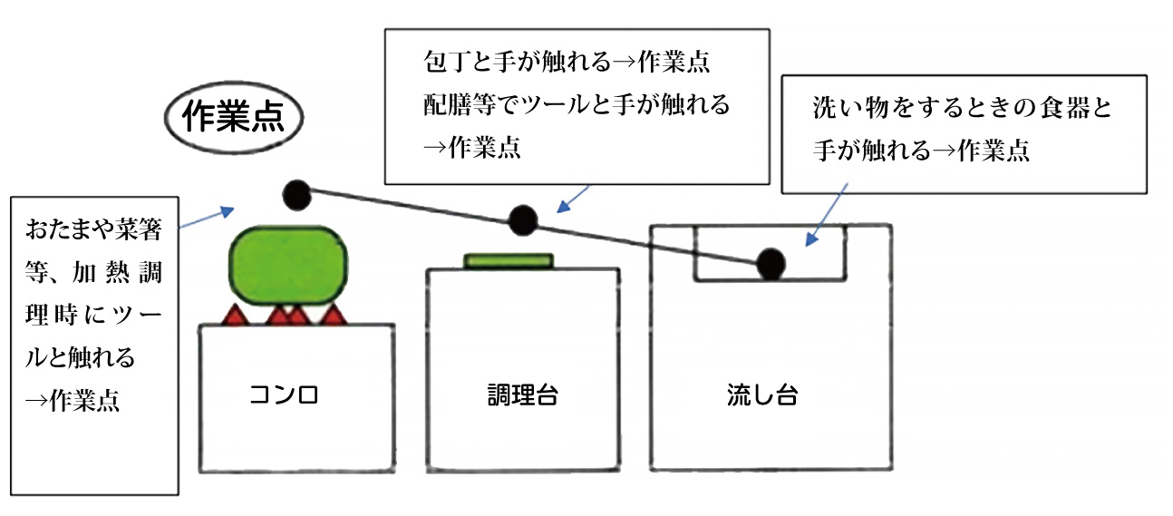 作業するときに使う道具と手の接点を作業点といいますが、洗う作業はシンクの深さ分だけ作業点が低くなり、切るときはまな板の厚み分だけ作業点は高くなる、というように、作業点は行う動作によって数センチ上下します。