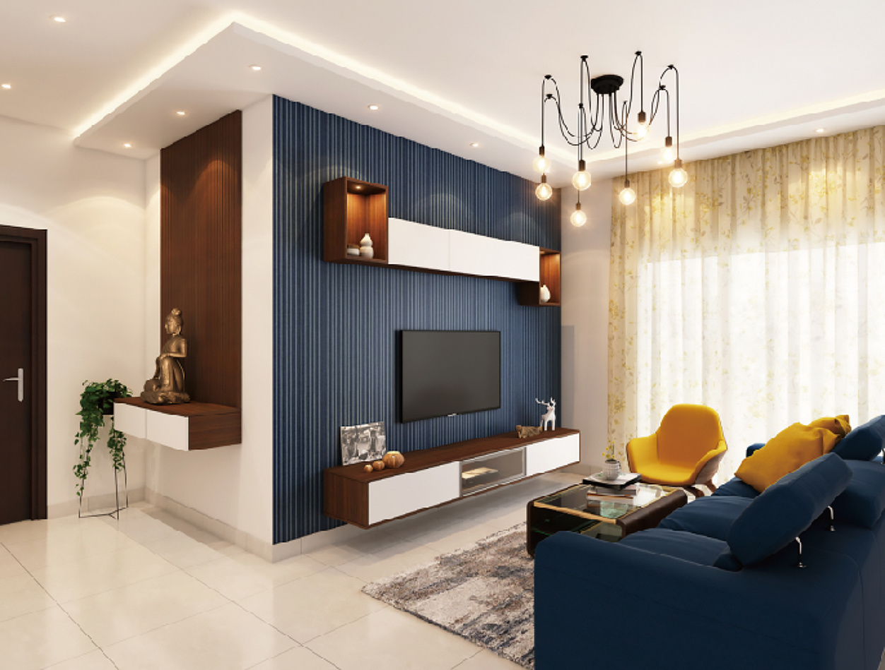 壁付けのフロート型テレビボードを付けたリビング。部屋に奥行が出て、抜け感を演出できる