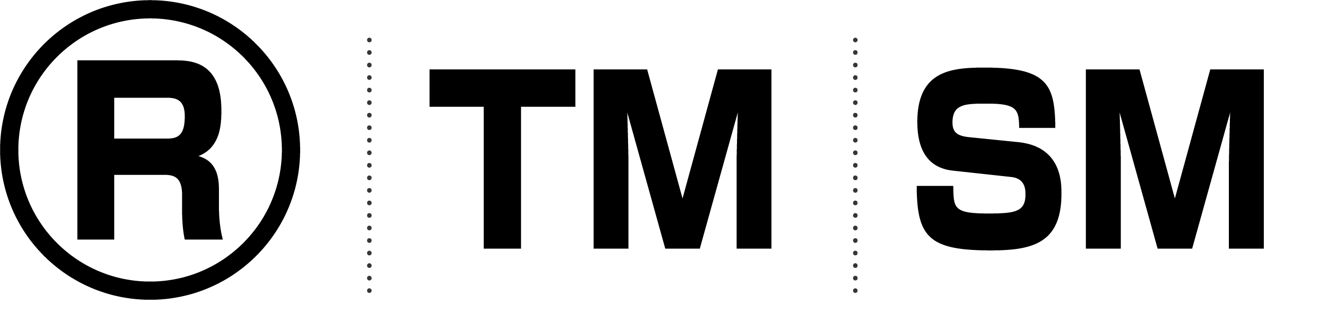 左端が“マルアール”のマーク。未登録の商標は、商品商標として「TM」(TRADEMARKの略・中央)を、サービスマークとして「SM」(SERVICE MARKの略・右端)を付けることができる