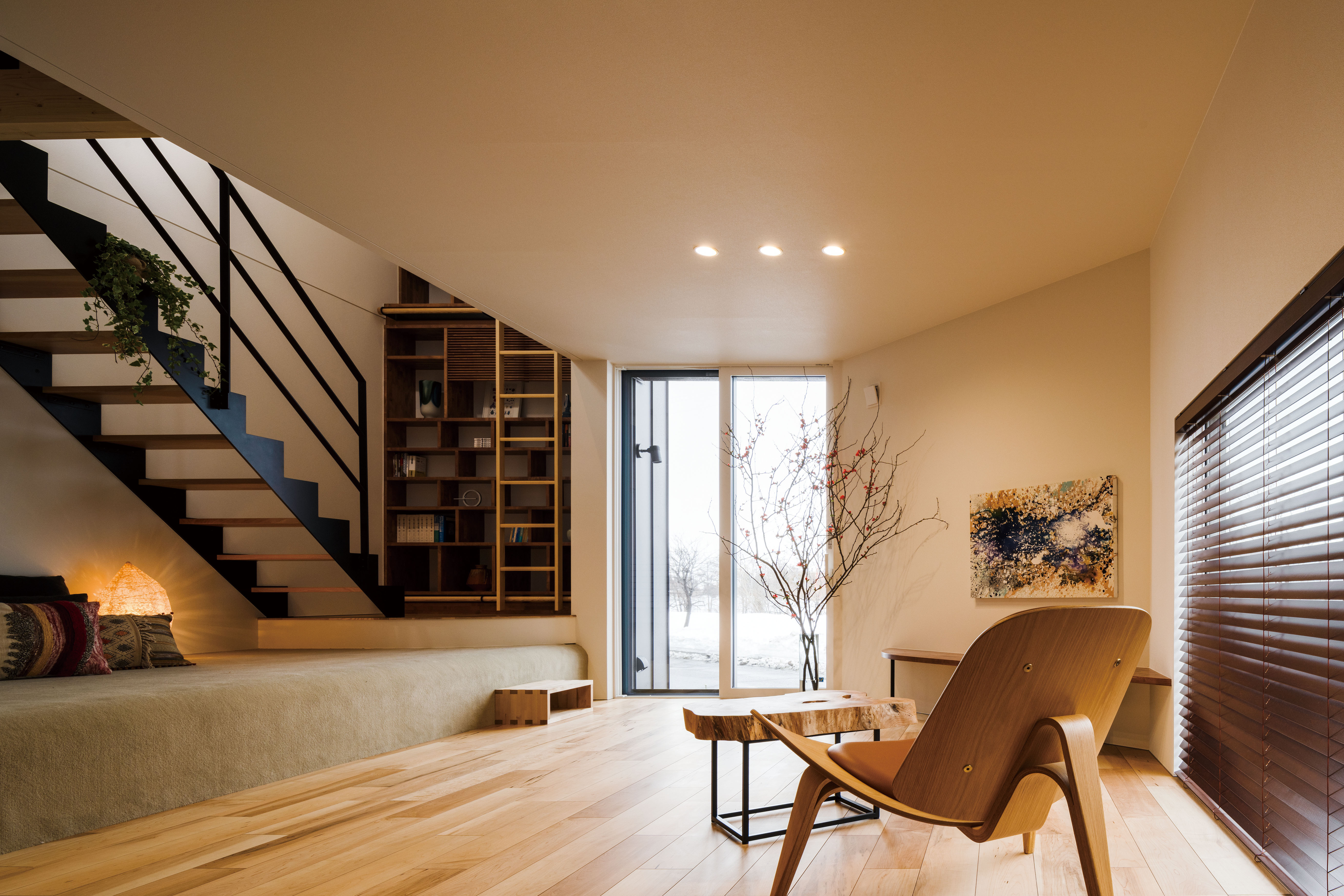 リビングの一角、階段下に設けられた小上がりが特徴