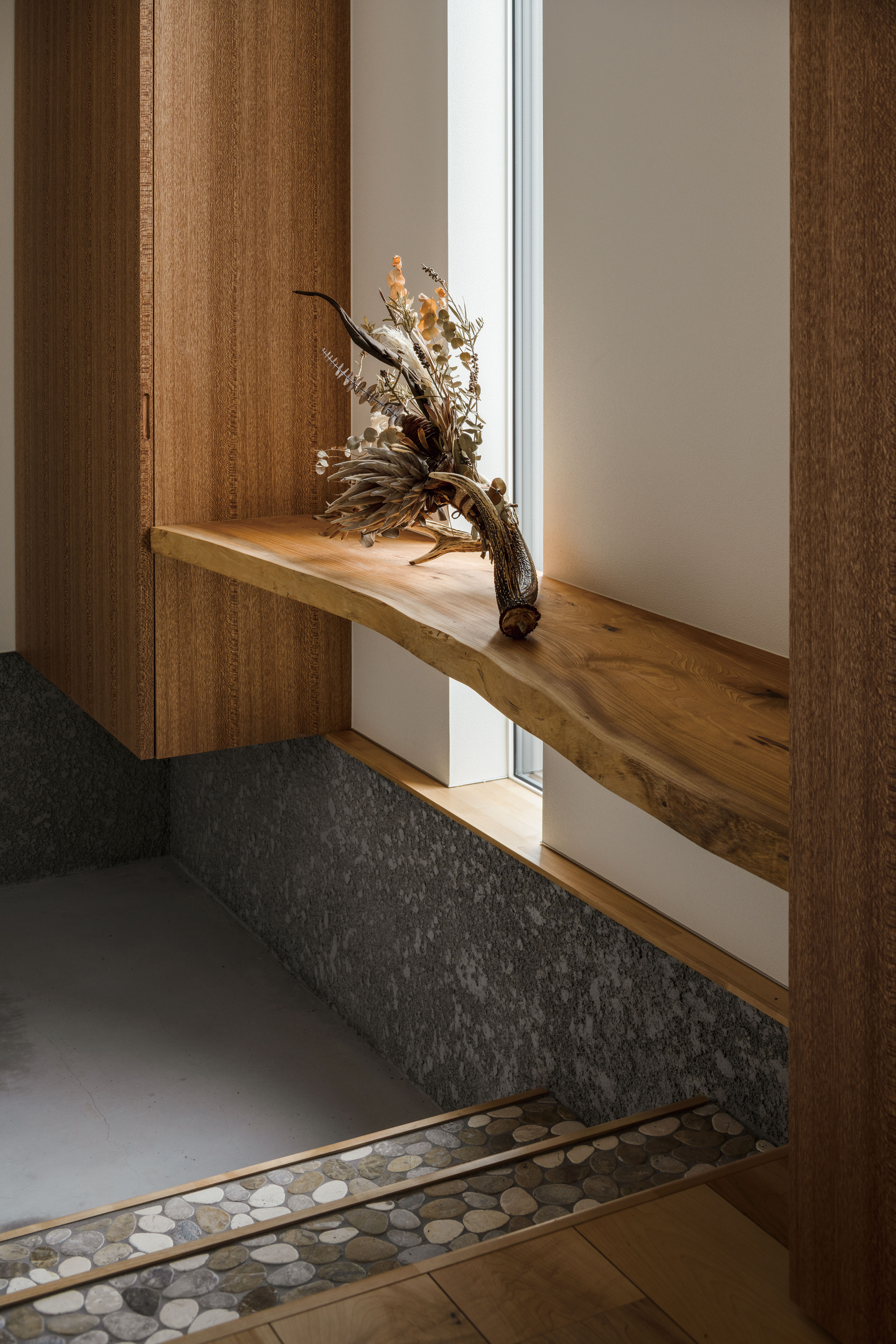 ケヤキの無垢材で作った玄関カウンター。あえて無骨な形状の素材を採用し、古材風の味わいを演出したという