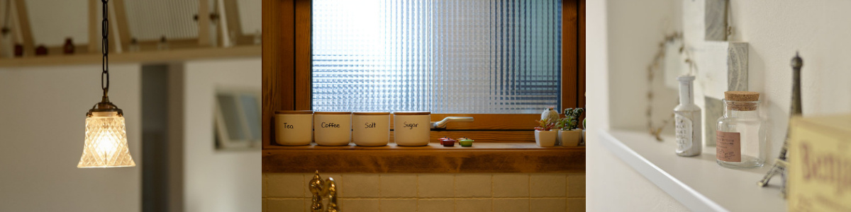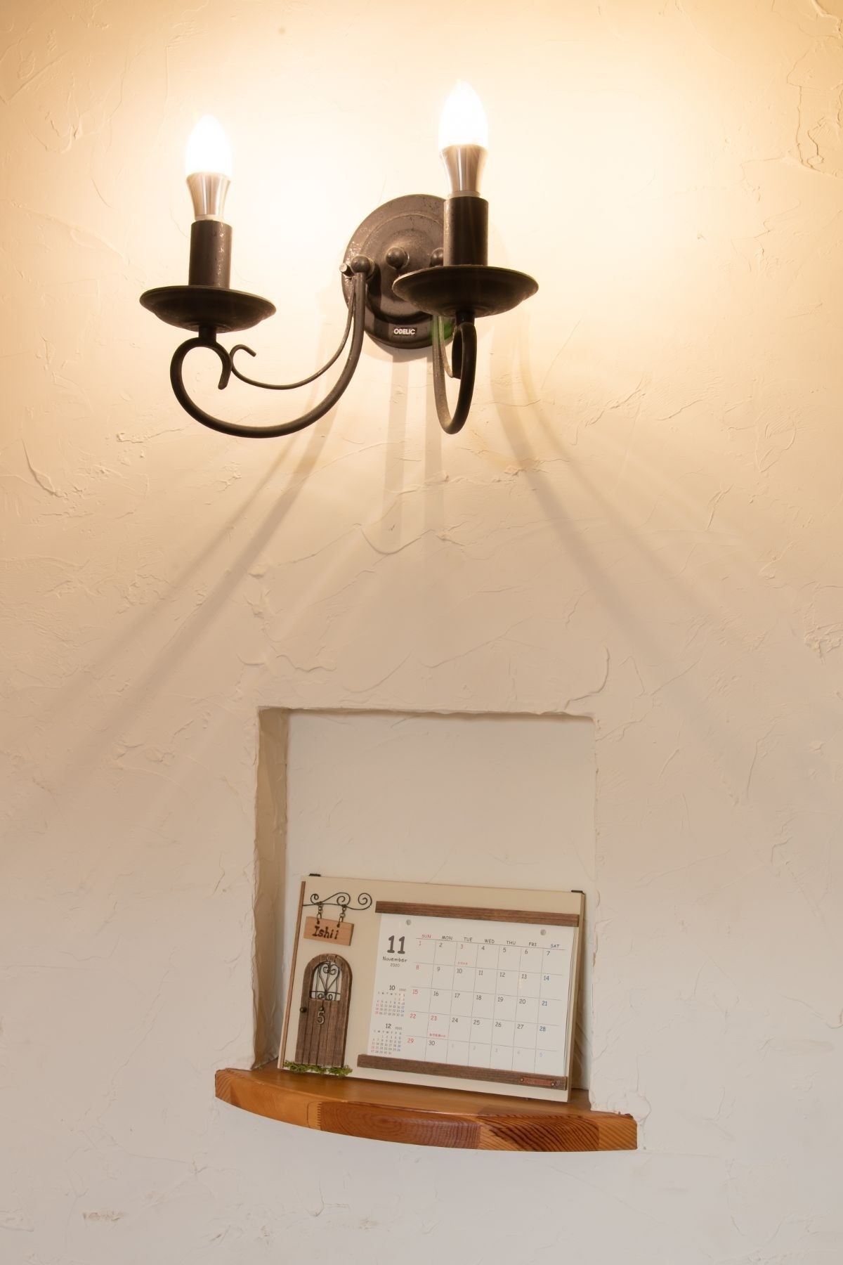 ■内装に無垢材や塗壁などの自然素材を用いることでてアンティーク雑貨に似合う落ち着いた空間を作り出す