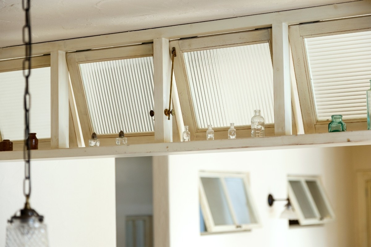 玄関からLDKへつながる中廊下の両側に寝室やユーティリティーが配置されています。玄関ホールや廊下、キッチンに付けた小窓がアクセントになっています。室内5カ所に付けた小窓は、すべて正方形で統一してリズミカルに。表面がゆらめいて見える波ガラスを使用しています。