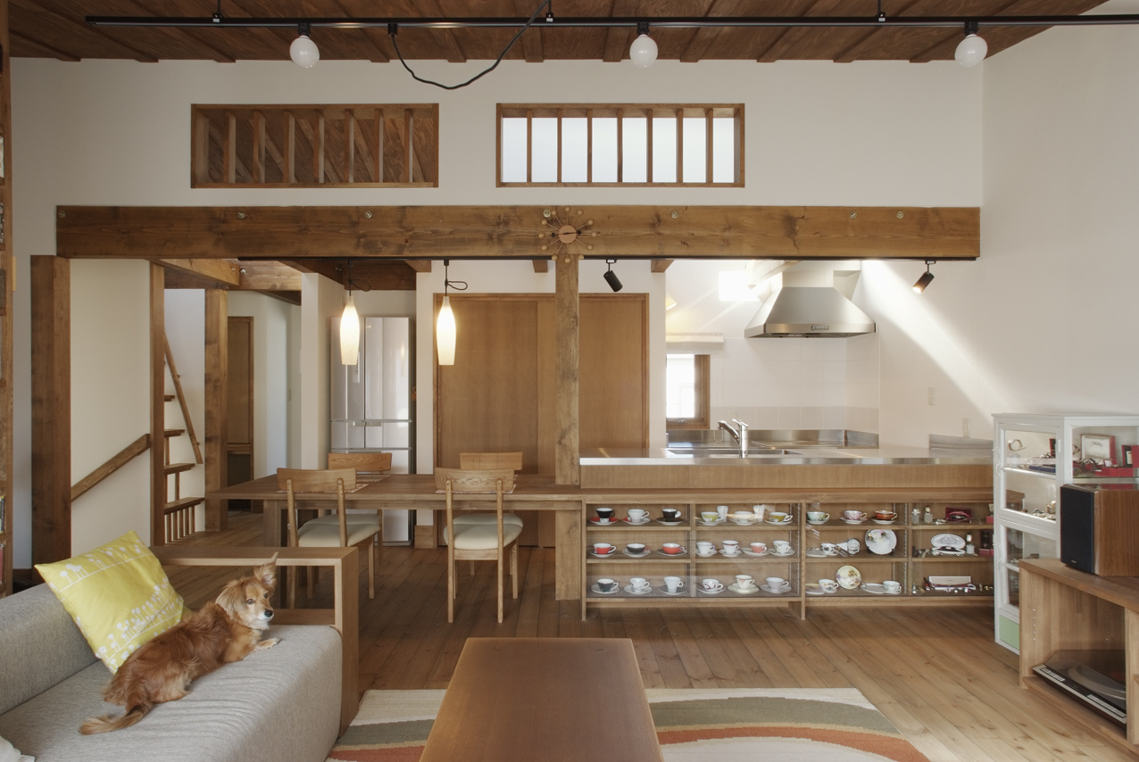 お酒を呑んだり、海外ドラマや読書、パソコン作業なども楽しめる、居心地の良い空間にできればということで…コの字型のキッチンにカウンターを併設するプランが実現しました。キッチンとダイニングの間の天井梁には、大正時代の農家の納屋を解体した際に保存しておいた100年ものの古材を採用。腰壁部分の羽目板、柱部分の木材も木目や色味、太さのバランスを考えてデザインしました。