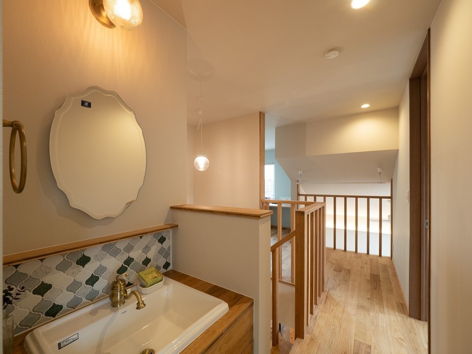 2階の洗面化粧台は、名古屋モザイクや真鍮の蛇口、アンティーク調のランプなど、室内インテリアにもマッチしており、特に気に入っています。