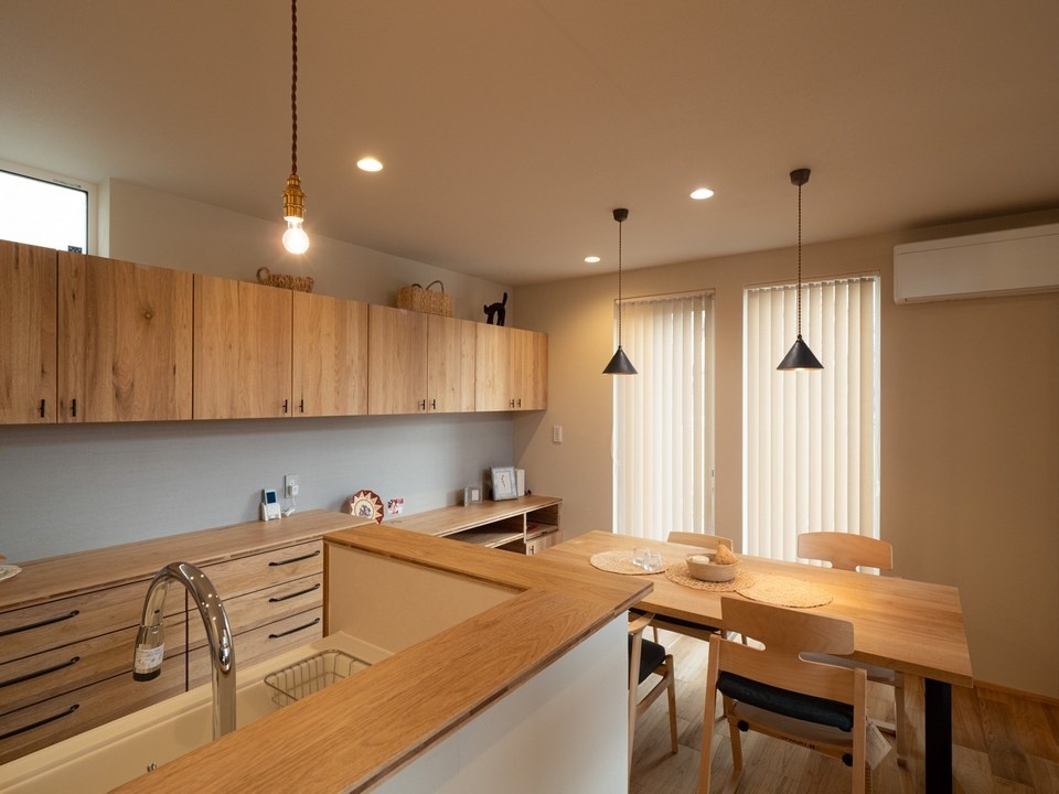 天然木で統一された心地よいダイニング・キッチン。幅5m以上におよぶ壁面収納は全てオリジナル。材料には高級家具などに使用されるクルミの三層材を使っています。木目や色合いの美しさに加え、割れや狂いが少なく靱性も高いため、永く愛用することができます。
