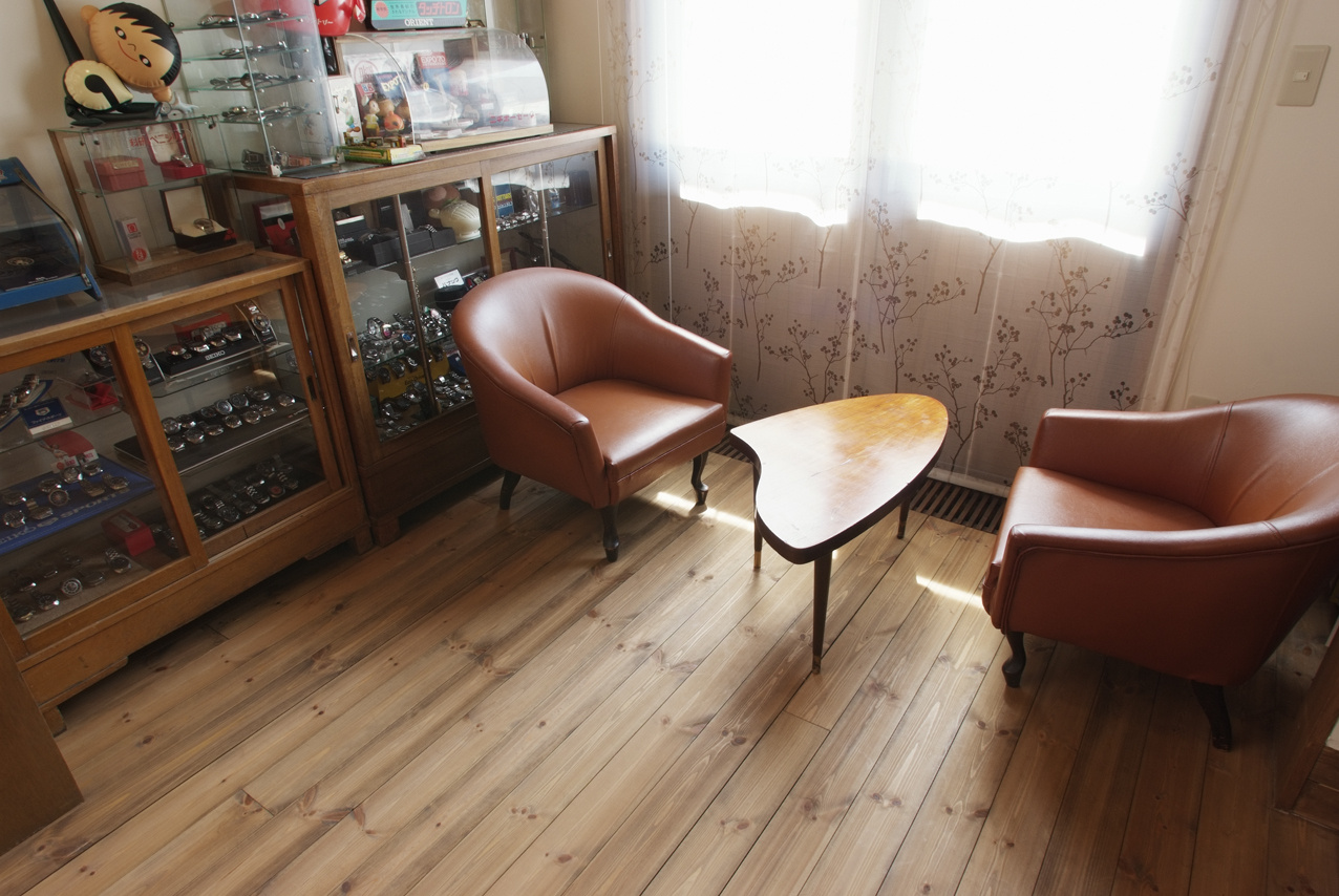 S邸を象徴するようなこのラウンジには、ご主人が集めたセイコー5SPORTSやオリエント時計など、昭和を代表する時計のコレクションが、まるで美術作品のように展示してあります。さらに、これらの時計が飾られる什器には、小さいころ文房具屋で見かけた絵具用のショーケースや薬やの陳列棚を利用。色や形も様々なモノが、しっくりこの空間に溶け込んでいるのは、Sさんの思惑通りだったようです。