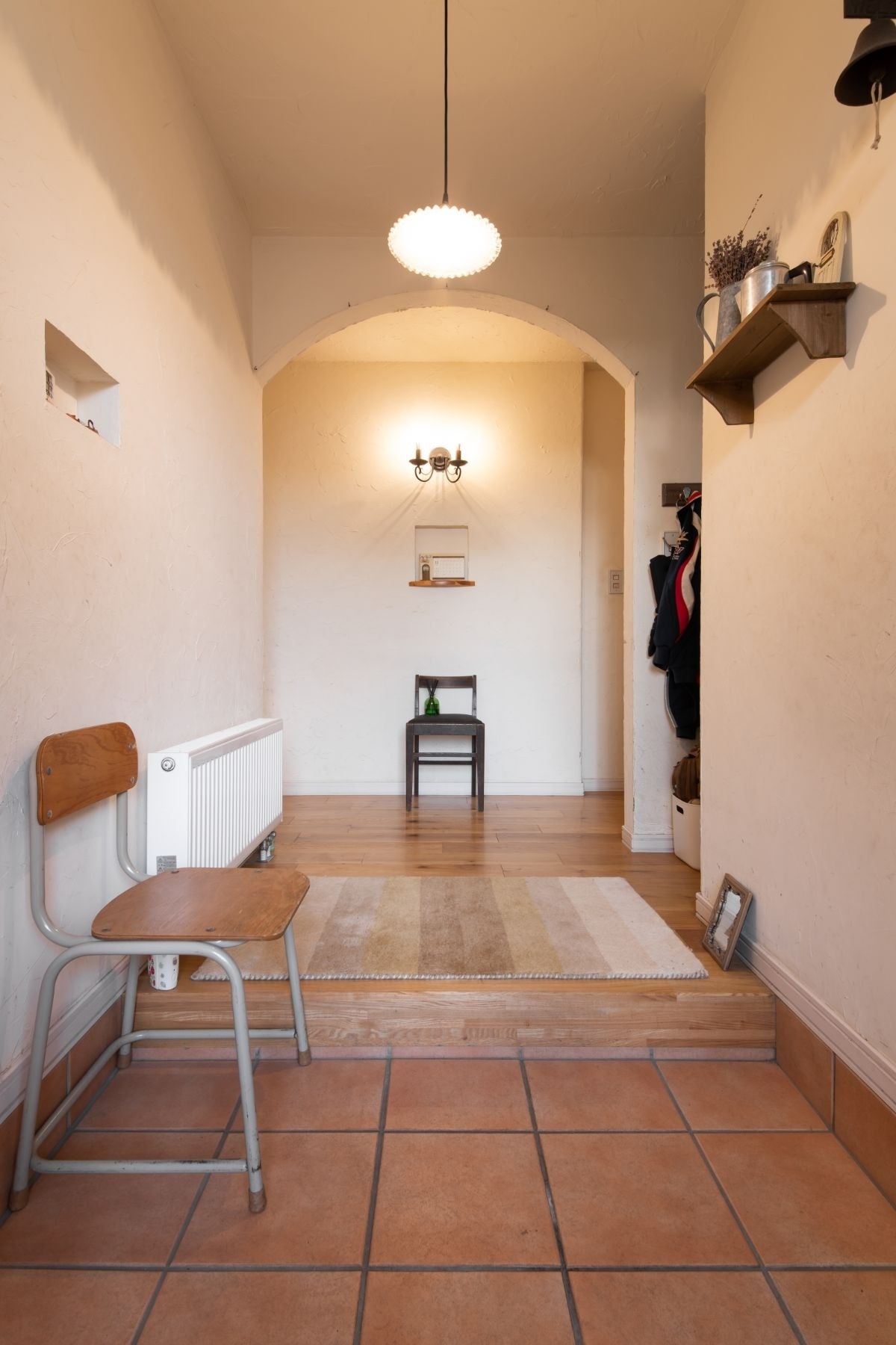 アールの下がり壁や玄関土間のテラコッタタイルなど、シンプルな中にも優しい形状、素材感に癒されます。