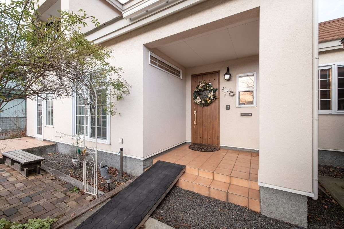 外観は暖色系でまとめたプロヴァンス風。アーチ型のポーチからもれる灯りを見たら仕事の疲れを忘れてしまいそう。屋根と同じ色合いのレンガを敷いた曲線のアプローチはHさんからの要望。