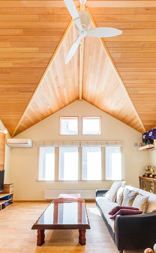 屋根形状を活かした梁のないデザインはご主人の希望で、「天井をつくるのはとても大変そうでしたが、梁を無くしたことで高窓から星空を眺めることもでき、正解でした」とご主人。