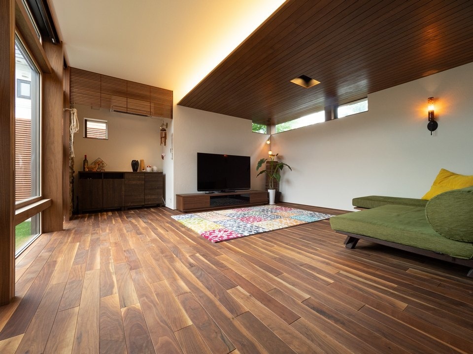 リビングはバリのリゾート風にコーディネート。ウォルナットの床材や、天井の間接照明が寛ぎの空間を演出しています。向かって正面のコーナーは将来アップライトピアノを置く予定なのだそう。