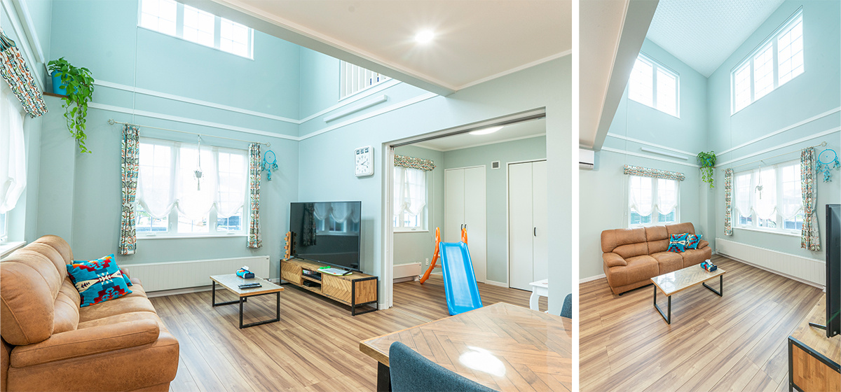吹き抜けがあり、リビングは明るく開放的な空間になりました。隣りの洋室はお子さまのプレイルームとして使用中。扉を開けて続き間にすれば、お子さんの様子も見守ることができて安心です。