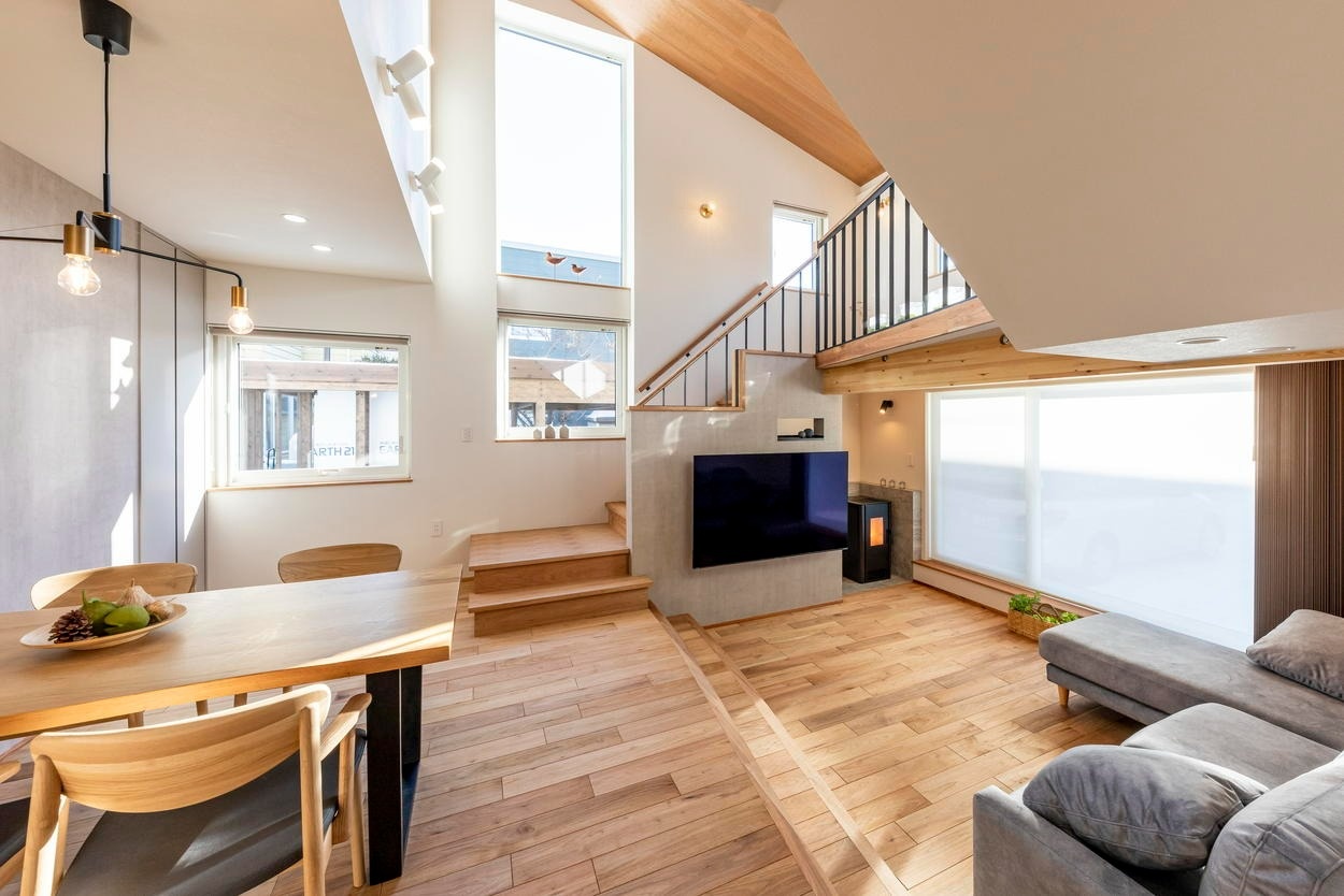 リビングダイニングに入るとすぐ、2階までの高さがある大きな窓が目に飛び込んできました。高く広がる空が見え、たくさんの光が降り注ぐ明るい空間です。リビングへとくだる踏み板部分は、奥さまの希望でゆるやかな曲線に。テレビの横には、M邸の暖房であるペレットストーブが置かれています。