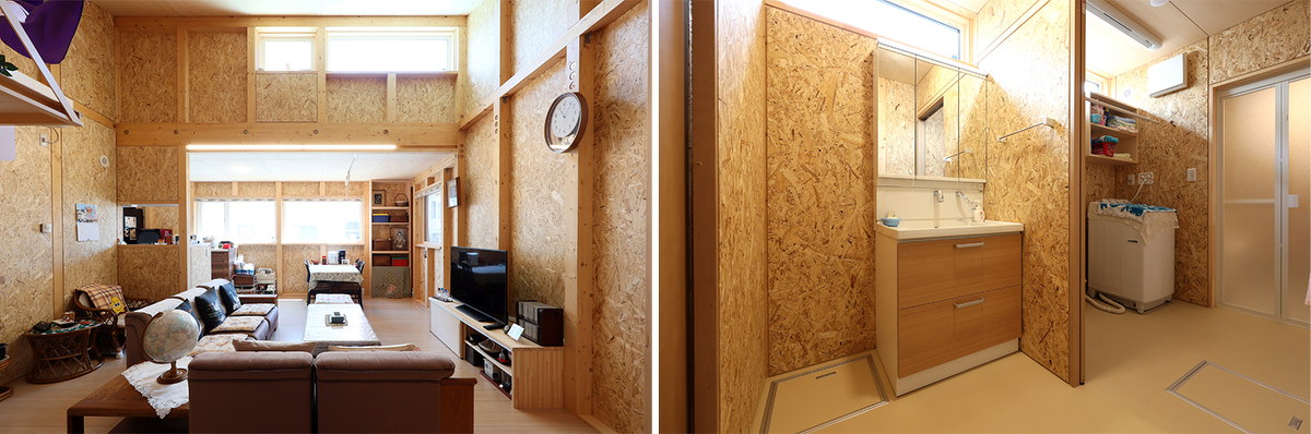(画像右)高窓からの採光とOSB合板の木目が温かな印象の洗面室と脱衣室。