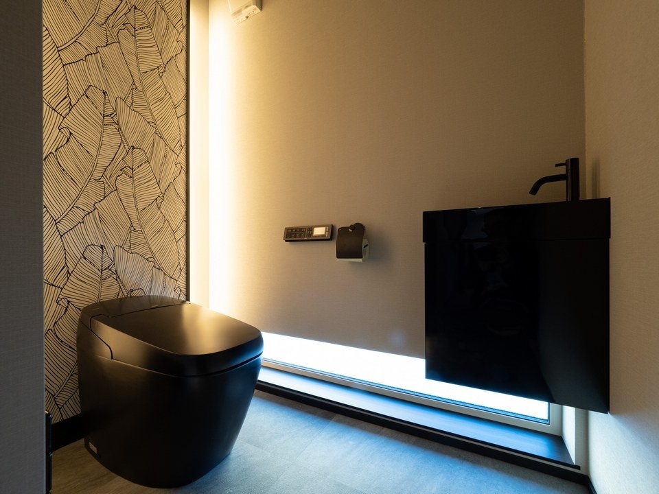 木の葉をモチーフにしたクロスを使った間接照明がお洒落なL字型のトイレ。入り口からはコーナーに取り付けた黒のタンクしか見えないので、そこがトイレであることさえ感じさせません。