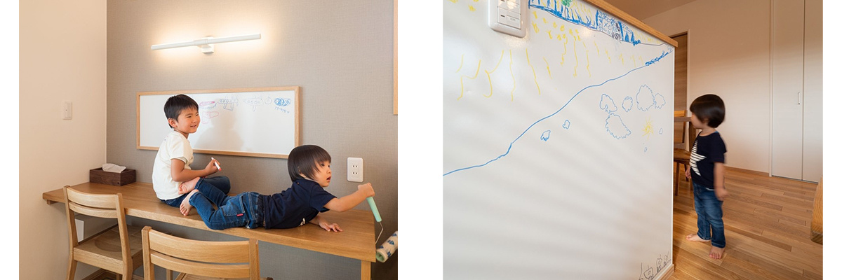 フリーカウンターの壁にもホーローパネルを設けています。お兄ちゃんもお絵かきに夢中!