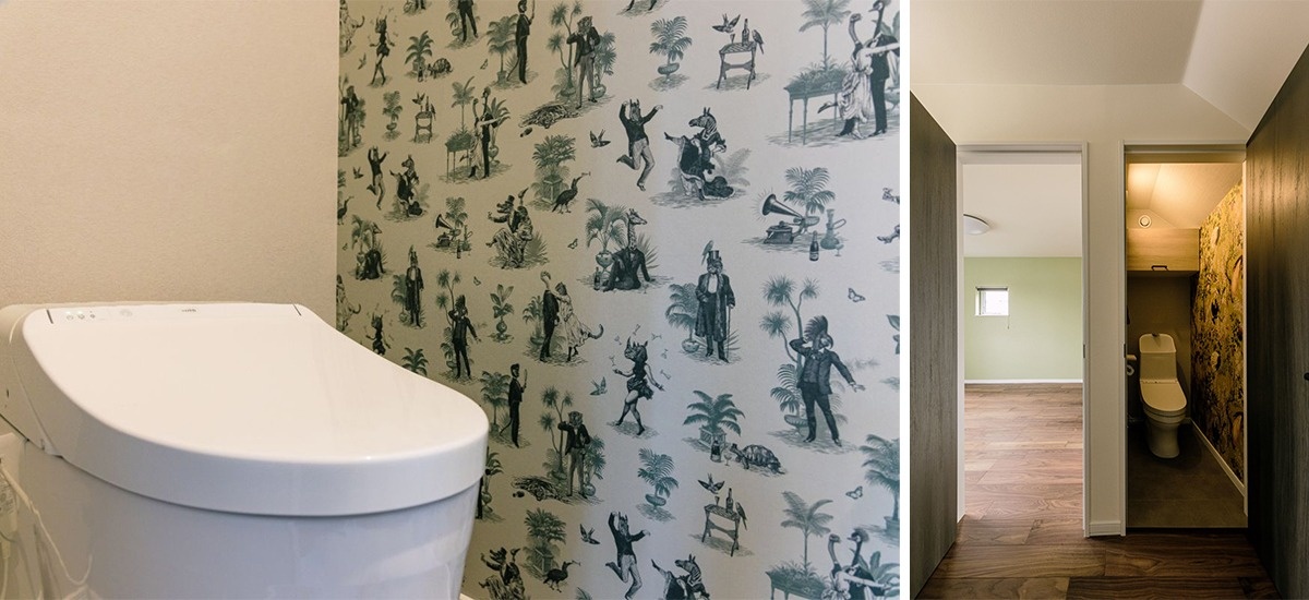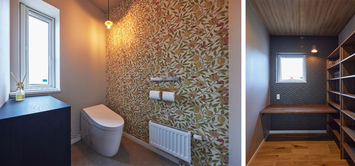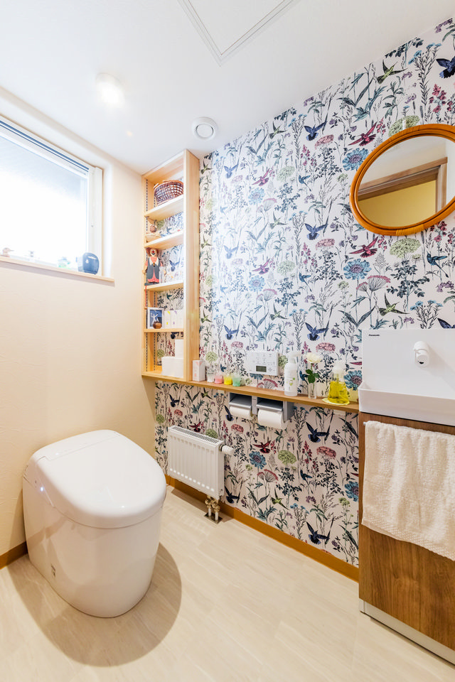 裏玄関横のトイレ。カラフルな壁紙に飾り棚も造作した遊び心あふれる仕上がりです。
