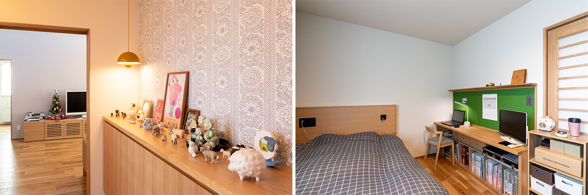 画像右側はご主人の書斎。「家づくりは主に妻の要望を叶えたかったので、ほぼ妻にお任せですが、書斎は、自分が、こじんまりとした落ち着く空間にしたいと要望して実現してもらいました」とご主人。
