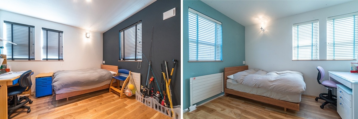釣りが趣味のお兄ちゃんの個室。ブラックのアクセントクロスに、壁付けのマリンライトがポイントになっています。