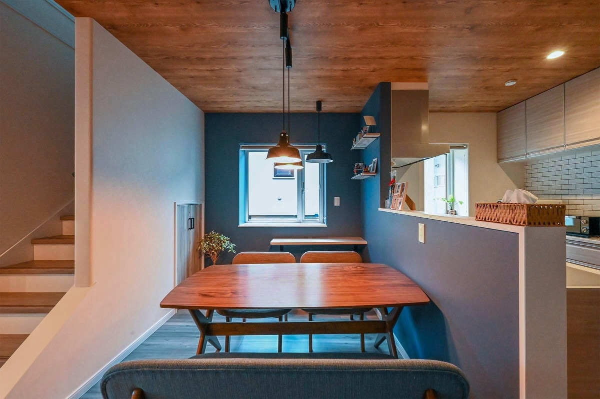 南の海のような深みのあるブルーのクロスを部分貼りしたダイニング。