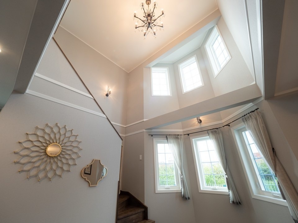 塔の室内側は、リビングの大きな吹き抜け空間になっています。レースのカーテン、半円の窓、アンティークなミシン台などが優雅な印象を醸し出しています。