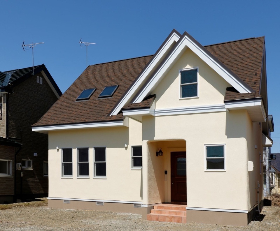 結婚した当時からマイホームを持とうと考えていたHさまご夫婦。完成見学会で朝日さんが手がけたカントリーテイストの家に一目惚れして以来、ずっと「建てるならこういう家がいいな」と思っていたそう。外観は奥さまのご希望で、オフホワイトを基調とした三角屋根のシンプルな形状。シンメトリー(左右対称)な美しいデザインとアーチを描いた玄関ポーチの入口も、奥さまの憧れでした。