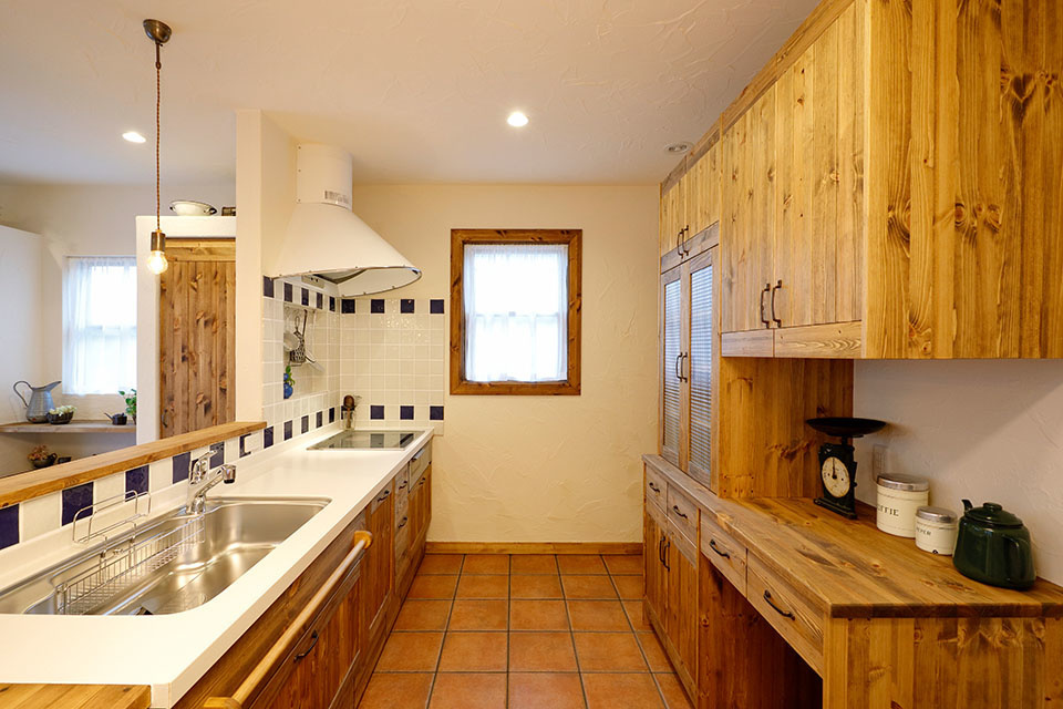 キッチンとダイニングは温かみあるカントリーテイストの中に、レンガ調タイルの硬質な素材感がマッチしています。