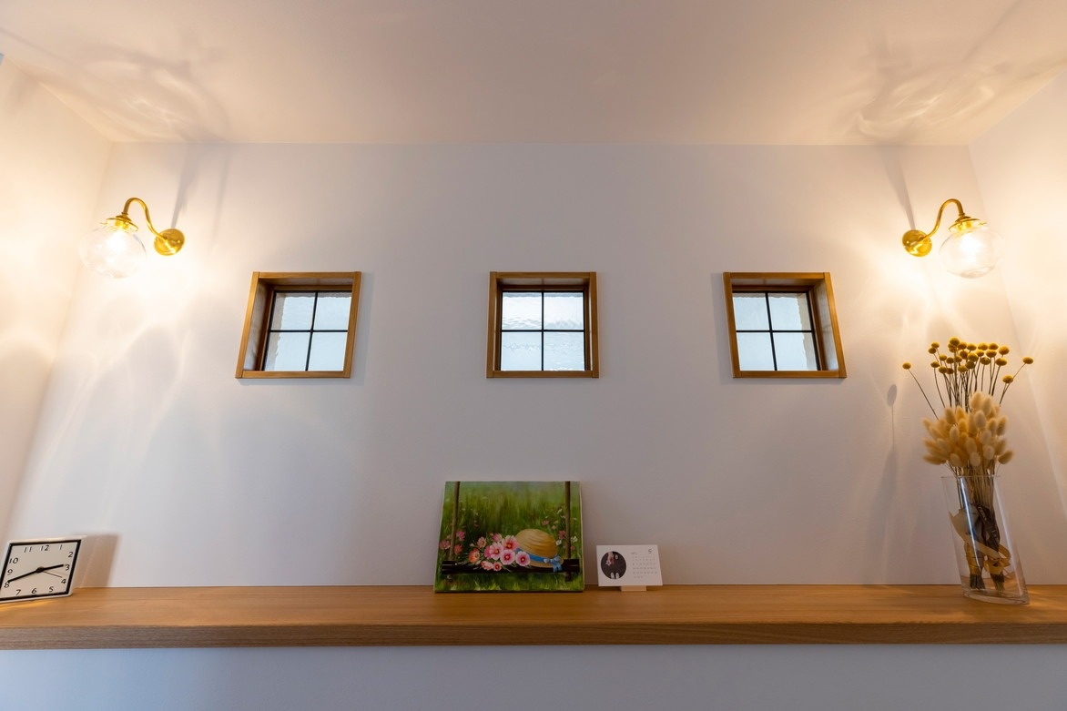 玄関ホールや廊下、キッチンに付けた小窓がアクセントになっています。室内5カ所に付けた小窓は、すべて正方形で統一してリズミカルに。表面がゆらめいて見える波ガラスを使用しています。