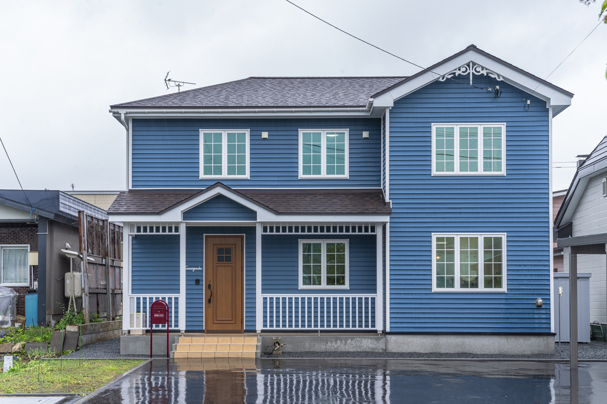 鮮やかな青の外壁に可愛らしい三角屋根、白枠のオシャレな格子窓、玄関ポーチとテラス――。旭川市内の住宅街に建つT邸は、アメリカの開拓時代の住居を思い起こさせるカントリースタイルの外観です。