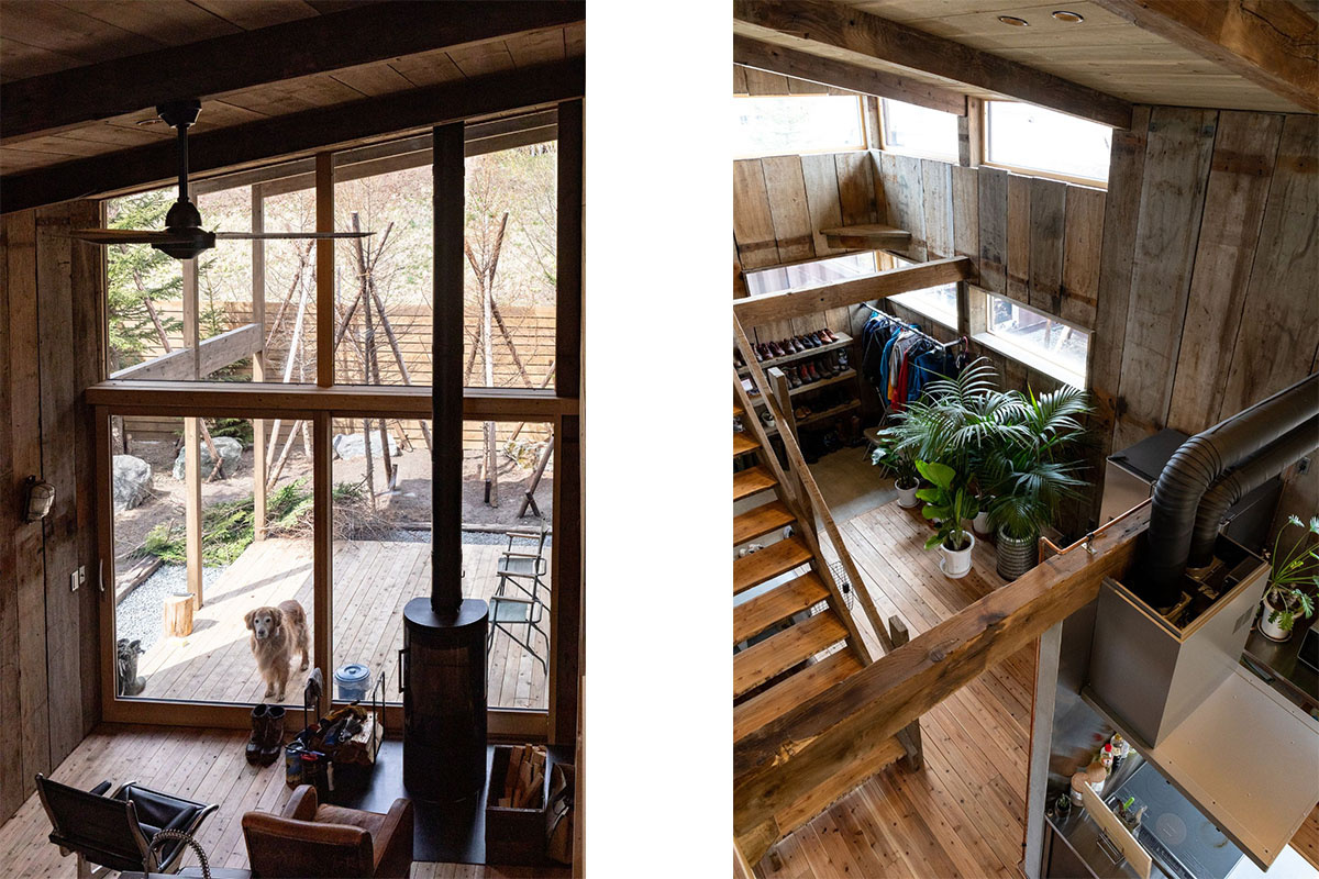 犬を愛するオーナーのYさんはアウトドアが趣味。できれば山に住みたい。ただ現実は経営するペットショップから離れて住みにくい。なら、住宅街に山小屋のような家と、木々を植えた“森”をつくろう―。そんな思いを形にしようと、自宅には古材をふんだんに活用し、わんちゃんがめいっぱい楽しめる庭もオーダーしました。特注キッチン、造作のお風呂、窓、階段なども必見です。