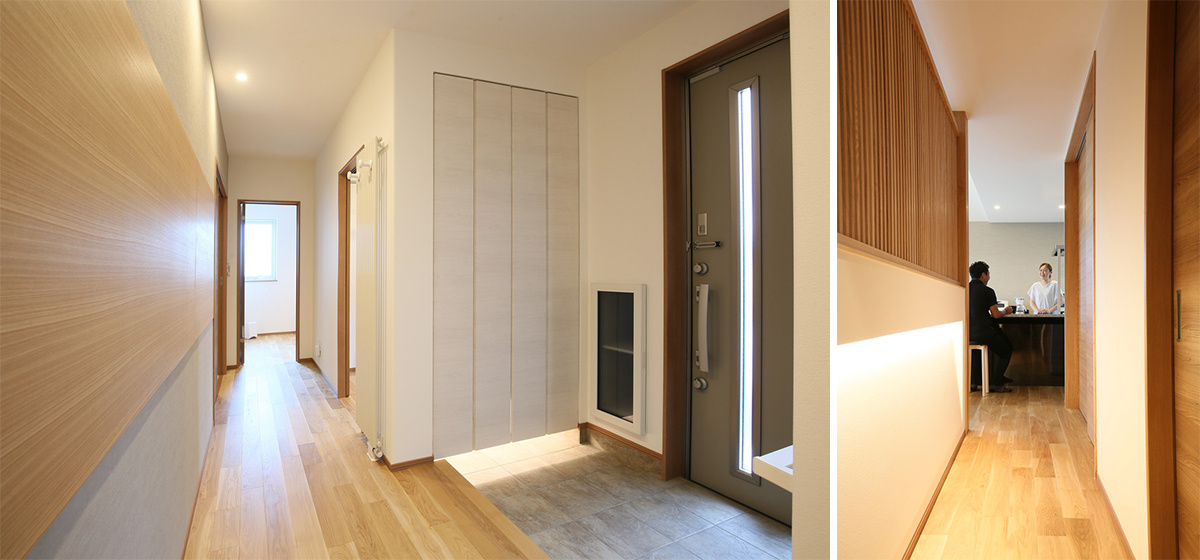 玄関正面の壁を横長に貫くタモ材の突き板のデザインは、ご主人が街で見かけて気に入った壁のデザインがアイデアの素に。LDKに続く扉の先に広がるのは、訪れる人が驚くような非日常の風景です。タモ材の縦格子や、陰影が美しい間接照明は和風旅館のような佇まい。そして、目の先に飛び込んでくるのはスタイリッシュなキッチンです。生活感をなくしたいというご夫婦の希望が、大胆な設計に反映されています。