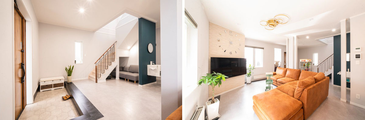 Sさん夫婦の一番の希望は、広いリビングでした。ポイントは、玄関ホールからリビングまで仕切りとなる壁や扉が一切ないこと。