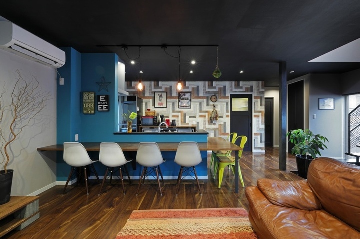 南の海のような深みのあるブルーのクロスを部分貼りしたダイニング。