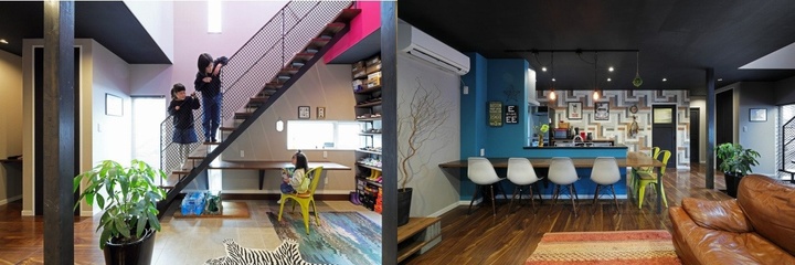 玄関ドアを開くと、LDKとつながる吹抜の土間空間に、スケルトン階段が伸びるTさん邸。家族がつながるオープンで使いやすい設計に加え、カラフルな壁紙を組み合わせたインテリアも素敵な一棟です。