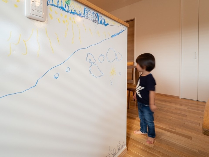 子育てファミリーのお宅でよく見かけるのが黒板タイプやマグネットタイプの壁紙。ホワイトボードを壁紙の代わりに貼るお宅もあります。お子さんがお絵描きをしたり、インテリアとして黒板アートを楽しむスペースになっています。