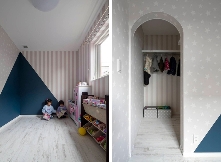2階も奥さまのこだわりが発揮されています。2つの子ども部屋は、個性的なクロス使いが目を引く内装で、共有のクローゼットでつながる設計。洋服の貸し借りなど、姉妹だからこそできるお楽しみもありそうですね。