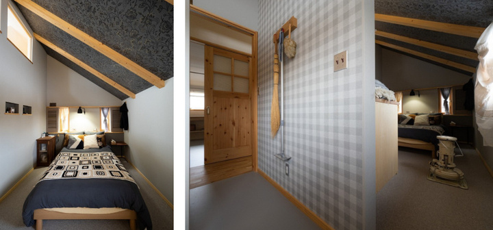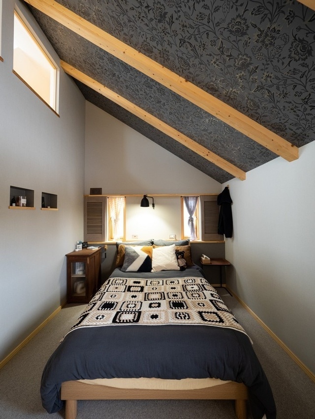 屋根勾配を活かした2階主寝室は、特にクロス選びにこだわった空間。飽きのこないよう、壁は無地にして、天井に柄をもってきました。植物を模したウィリアム・モリスの図案です。洗面トイレ室にはチェック柄のアクセントクロスを採用しました。清潔感と共にリズミカルで楽しい雰囲気になっています。