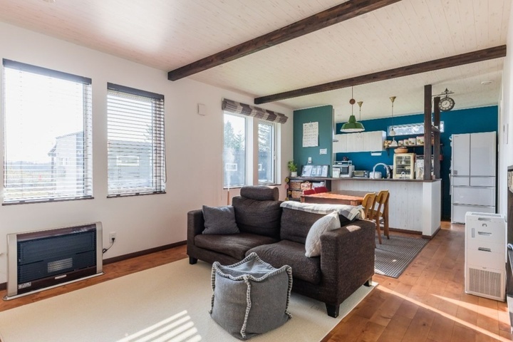 扉を開けると広がるLDKは、木をふんだんに使い、温かみのあるカントリー風の雰囲気。白を基調とした明るい空間を、ダークブラウンの梁や柱、ソファと壁紙のカラーとが引き締め、どこかモダンで垢抜けた印象になっています。