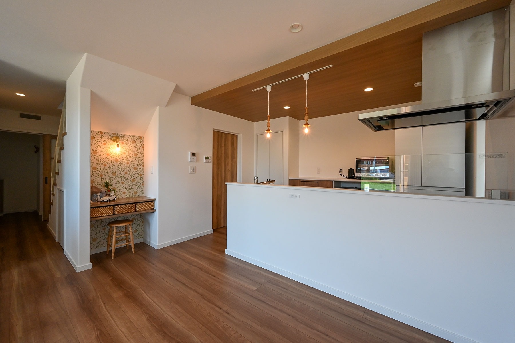 「見た目をとても大事にしました。内装の色味が統一されていて、照明や家具、雑貨など自分の好きなものに囲まれている―そんな家にしたいと思っていました」と奥様。その想いがかなった室内は、白いクロスをメインとしつつ、木目柄の床・天井材や建具、草花・樹木をモチーフとしたウィリアム・モリスのクロスなども使ってコーディネート。