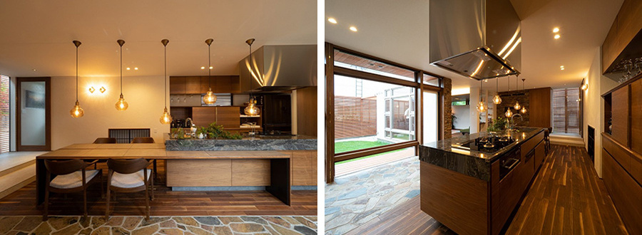 アイランド型のキッチンや背面収納は全て北渡建設のオリジナル。キッチンのワークトップには天然の御影石を、連続するテーブルの天板にはセラミックタイルを採用しています。キッチンからはL字に配されたリビングや中庭が見渡せます。