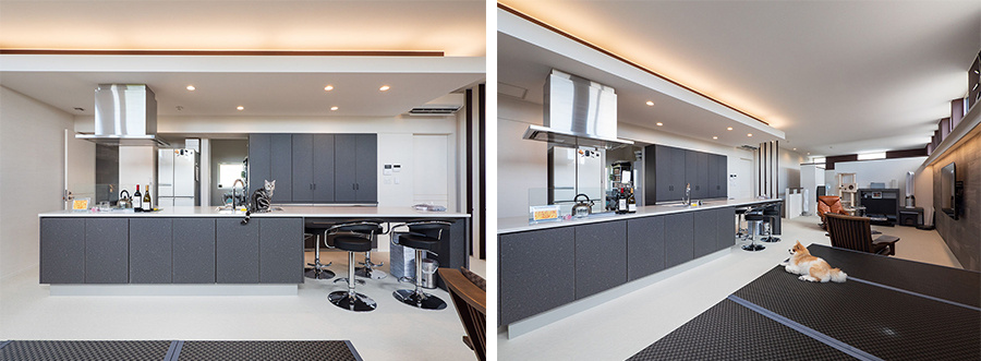 LDKは横長で24畳と広くなっています。圧巻なのは、アイランドキッチンの天板。シンクの横から延長してそのままダイニングテーブルとして使うプラン。幅4m以上ある大きな天板はインパクト大です。料理を作ったらそのまま横に移動して食事し、後片付けも楽。動線も無駄がなくて良いのです。