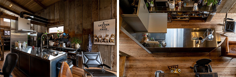 キッチンは、天板を厨房機器メーカーで、フレームを鉄工所で特注。溶接の跡を残し、塗装せず素材感を出しています。キッチン、ダイニングは1フロア。2階の子ども部屋にも扉はなく、ほぼ1フロアで暮らす感覚です。
