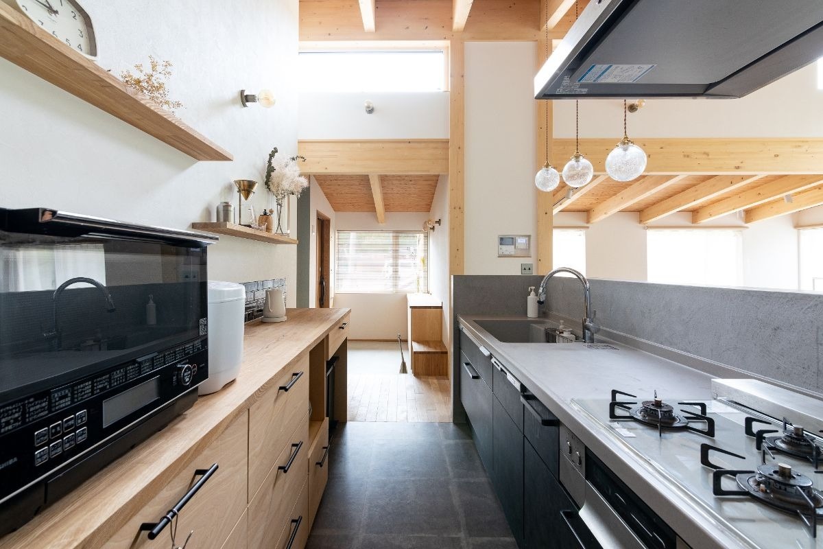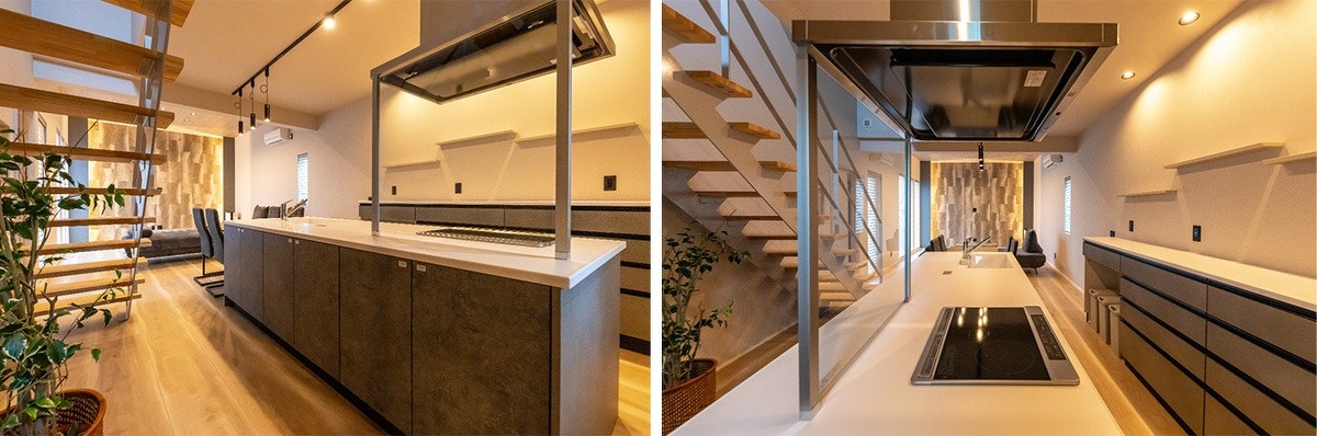 キッチンはキッチンハウスの姉妹ブランド、グラフテクトのアイランド型です。コンロは背面にあり、スペースが広く活用できる造りで、「2人で一緒に台所に立つので、このほうがチームプレーで家事ができますね」と奥さま。Tさんも、「手伝いやすいキッチンで、息子も気がついたときは “何かしようか?”と言ってきます」。