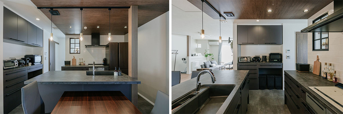 「視線の奥に暗い色を持ってくると空間が広く見えると聞いて」と、天井はダーク系の木目クロスを使った下がり天井に。床には濃い石目のデザインを合わせ、黒いキッチンと一体感のある空間に仕上げました。