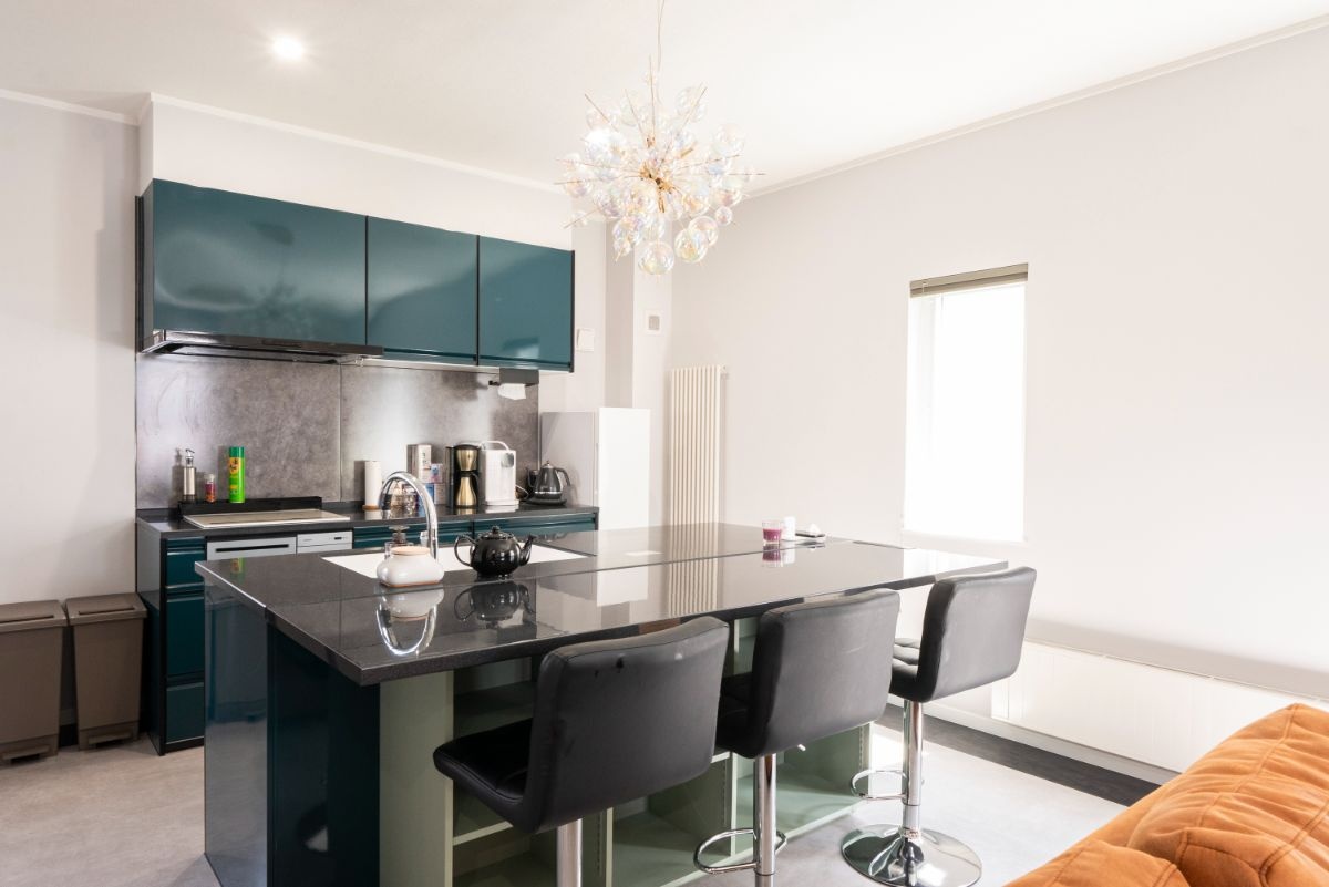 造作による豪華なリビングドアを抜けると、ダイニング・キッチンが広がっています。間接照明やガラスのペンダントライトがムーディーでラグジュアリーな空間を演出しています。