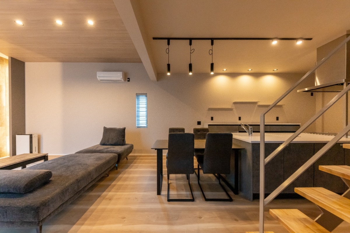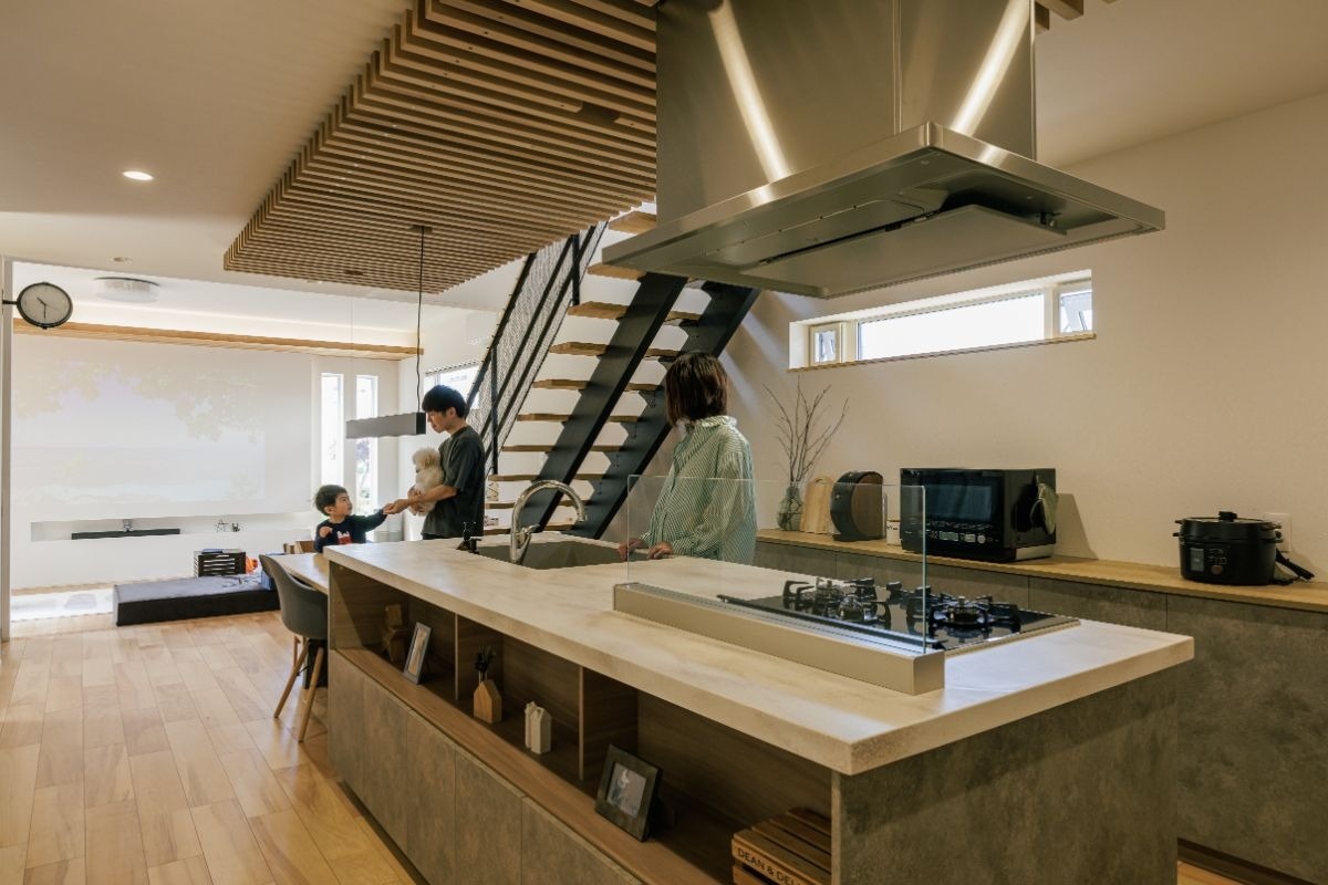 一階は脱衣・浴室・収納空間のほかは、個室を設けずリビングダイニングを最大限大きく確保する間取りにしました。そして大きなリビングダイニングにはアイランドキッチンも似合います。